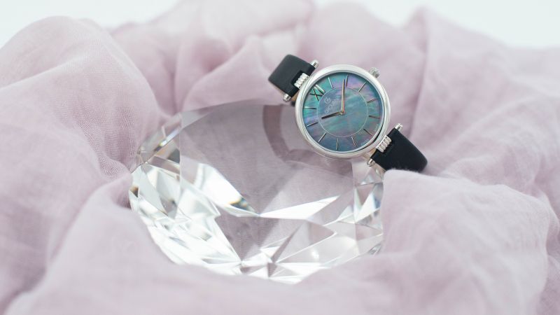 Esfera nácar con elegantes índices de bastón.
